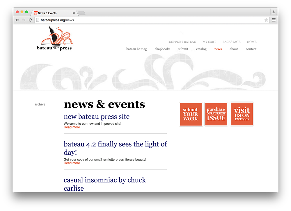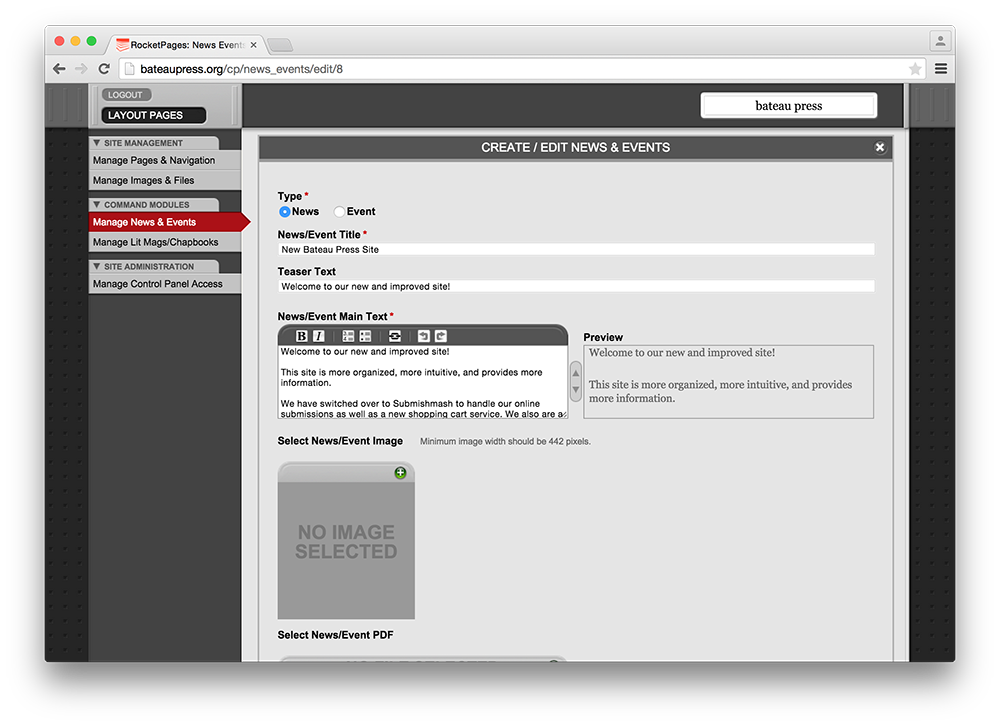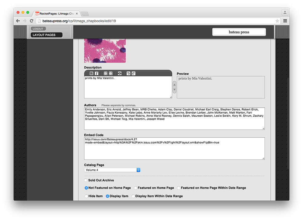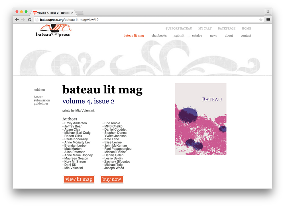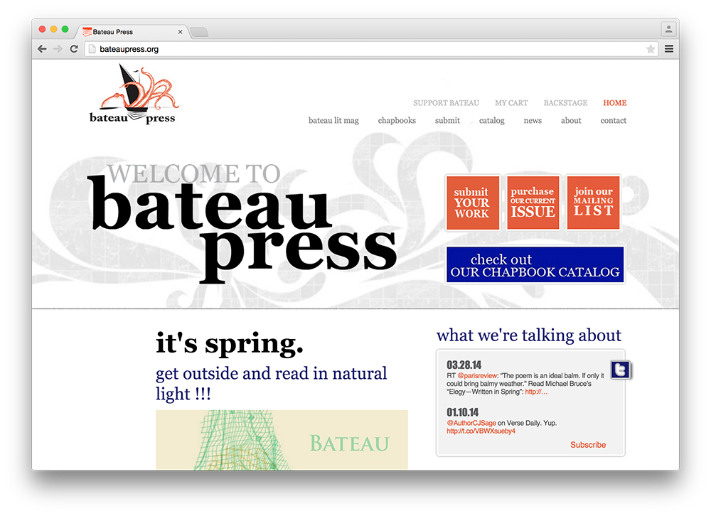 Independent literary magazine publisher that needed a site to assist promoting and selling their journals and chapbooks. Created wireframes and mockups to settle on site structure, then built interface to handle custom features and built html templates from designer’s photoshop files. Built on top of RocketPages.