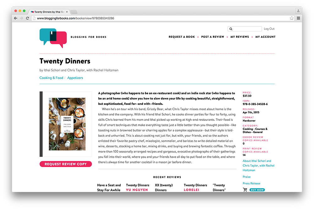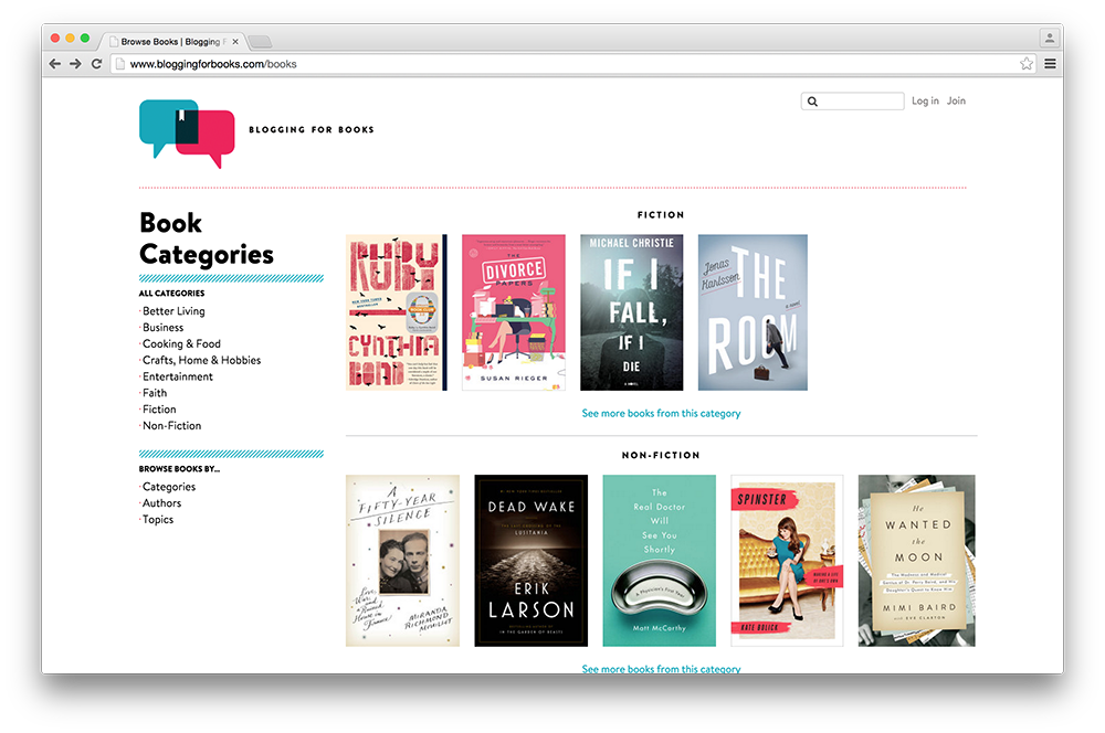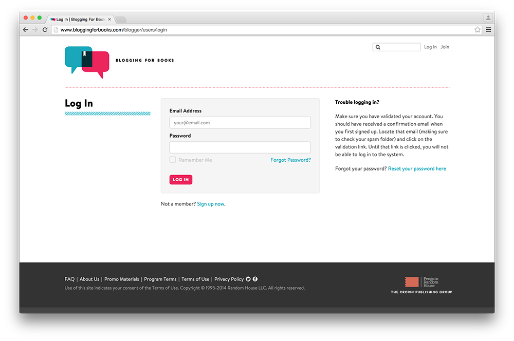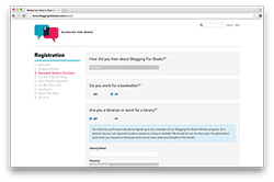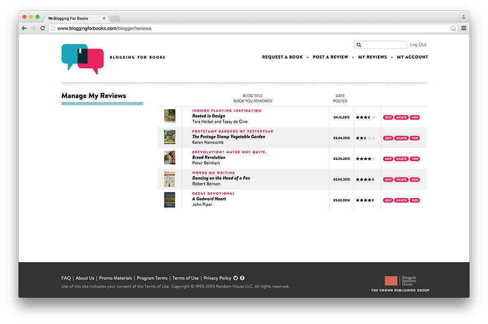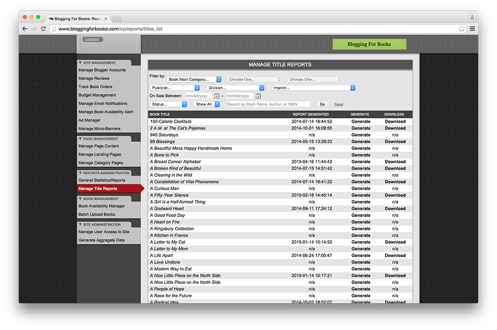 Marketing site for RandomHouse titles. Public bloggers are able to sign up for an account and request books in exchange for posting reviews. As the program has expanded, it was redesigned to better reflect RandomHouse as a whole instead of just a subset of imprints. Features extensive controls for managing book availability, bloggers registered, titles orderered, and reviews submitted as well as interfaces for other interactions needed for site display and operation - admin users, emails, ads, content, statistics, and reports.