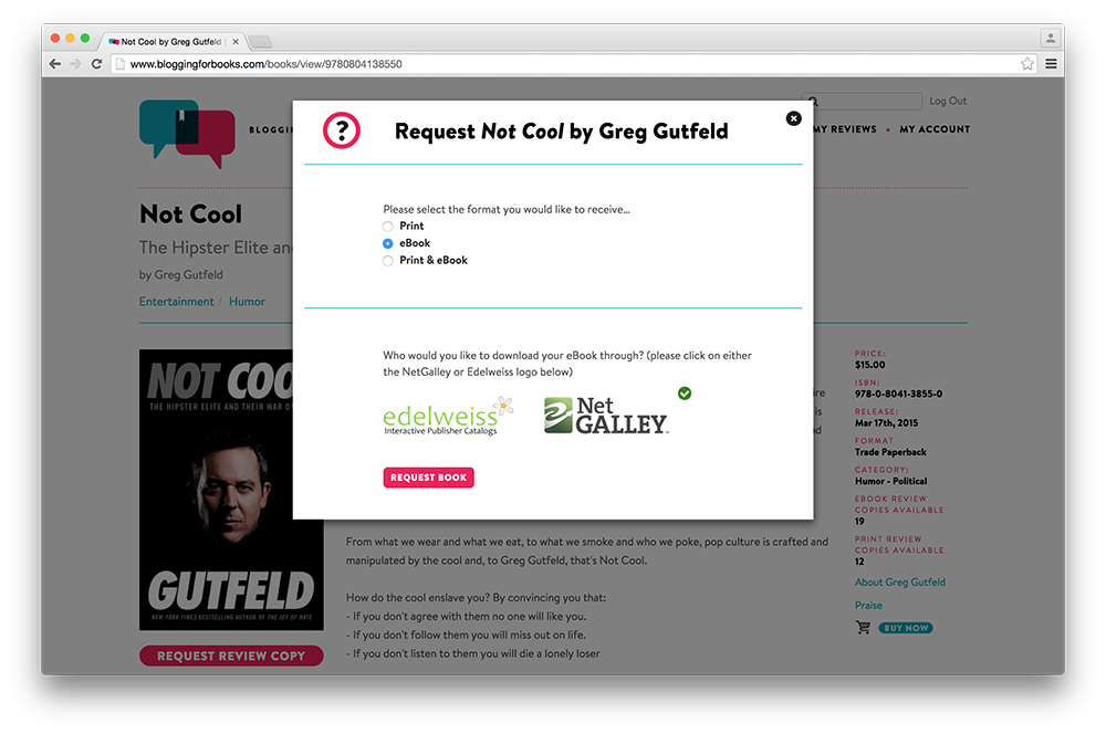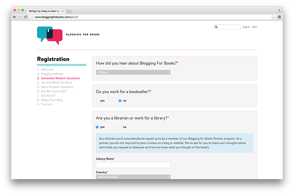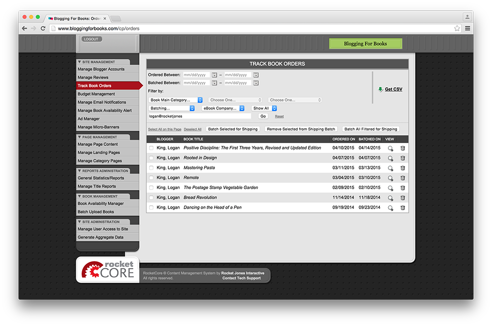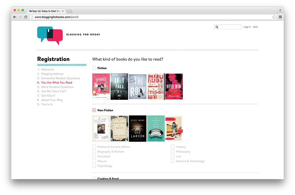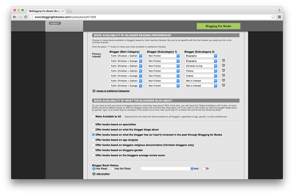 Marketing site for RandomHouse titles. Public bloggers are able to sign up for an account and request books in exchange for posting reviews. As the program has expanded, it was redesigned to better reflect RandomHouse as a whole instead of just a subset of imprints. Features extensive controls for managing book availability, bloggers registered, titles orderered, and reviews submitted as well as interfaces for other interactions needed for site display and operation - admin users, emails, ads, content, statistics, and reports.