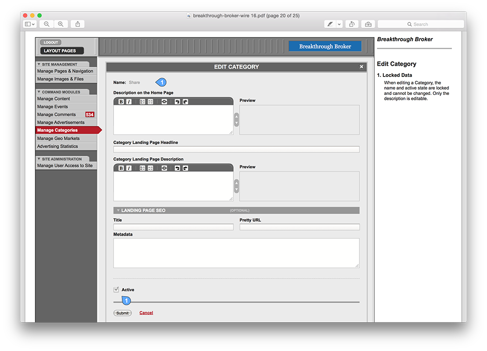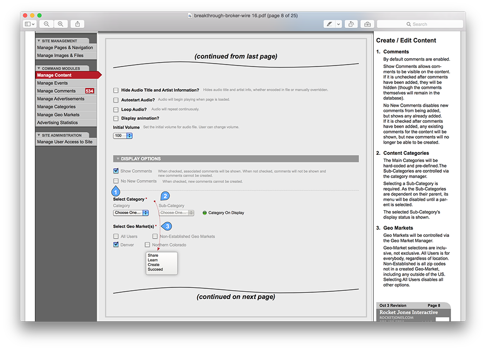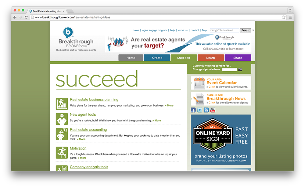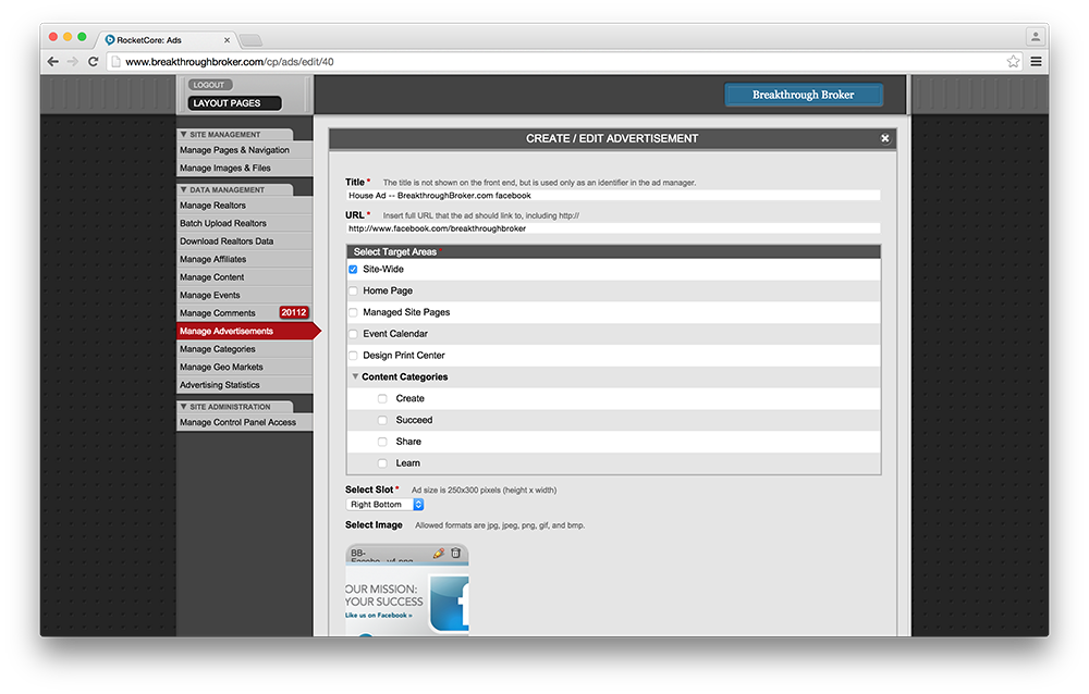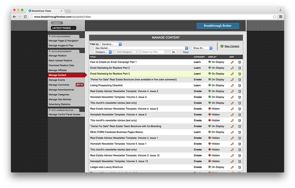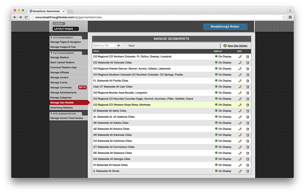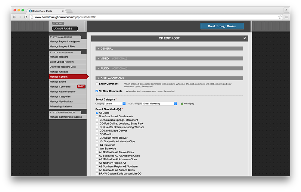 Creation of an ad-based, regional content site for real estate brokers. Primarily focused in the US. Integrates with on-demand print service to order shared marketing materials. Built on top of RocketPages.