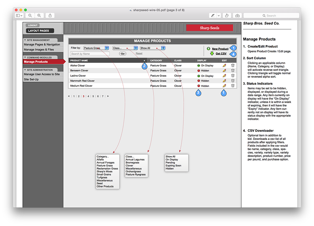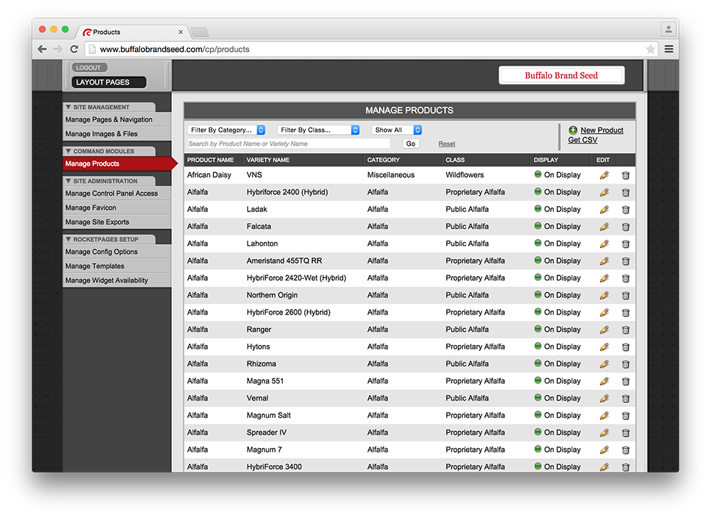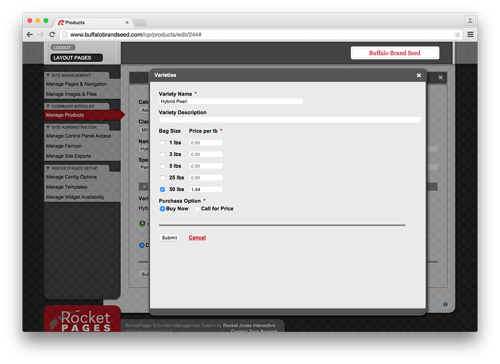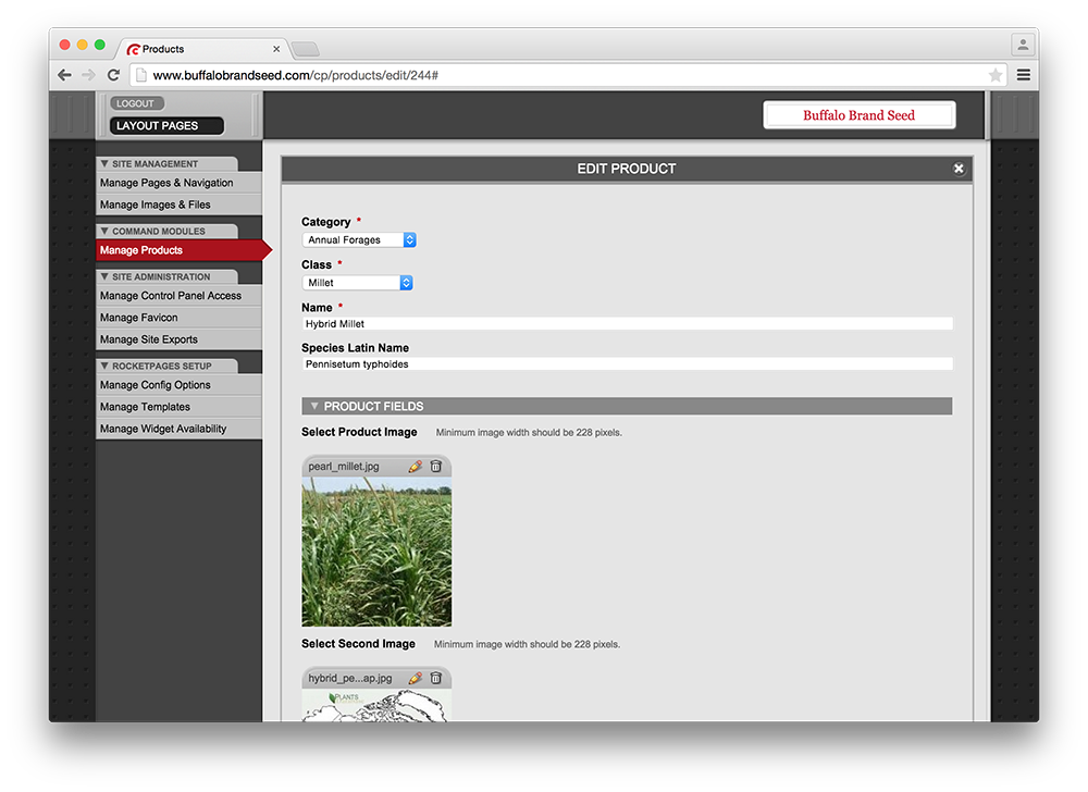 Client needed a modern site with controls for handling promoting and selling seed varieties. Determined application structure and needs through wireframing process, then was responsible for building the admin forms to control the site. Built on top of RocketPages.