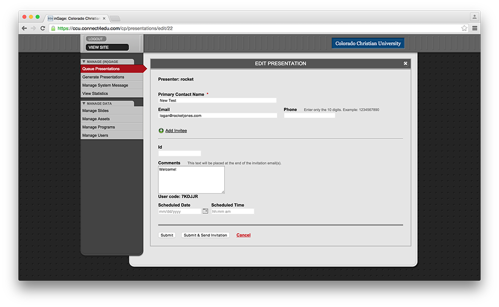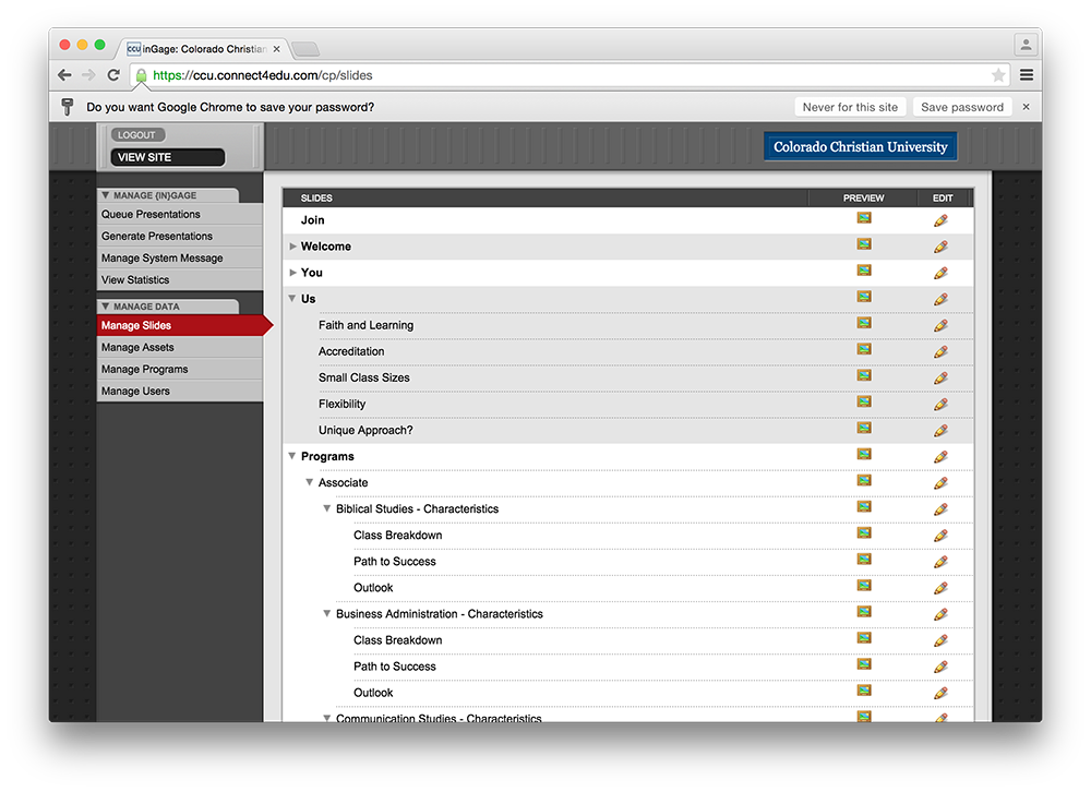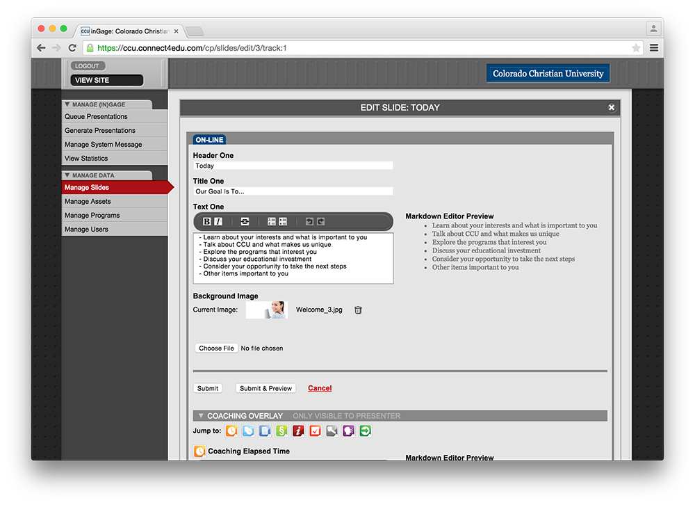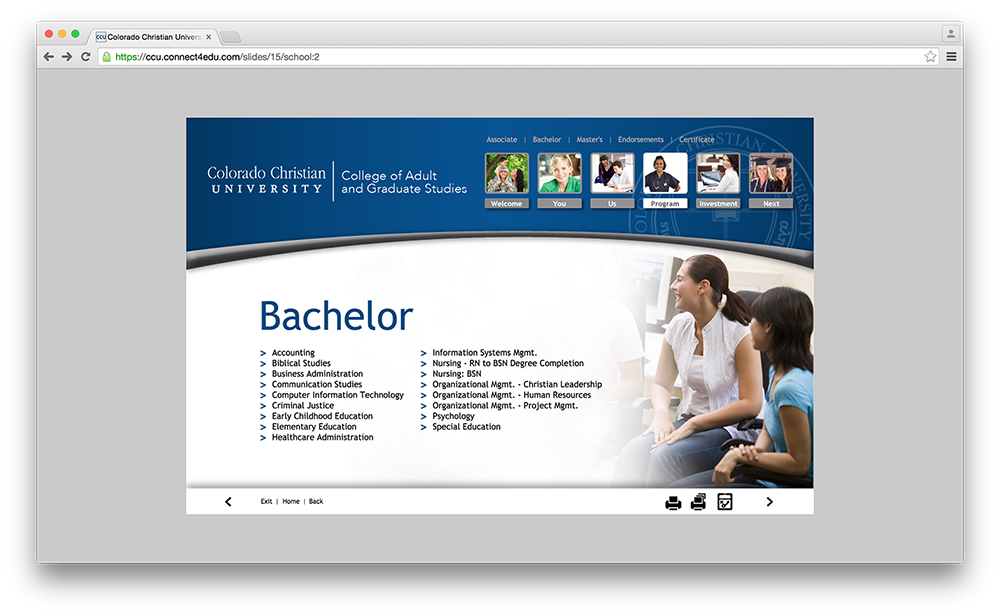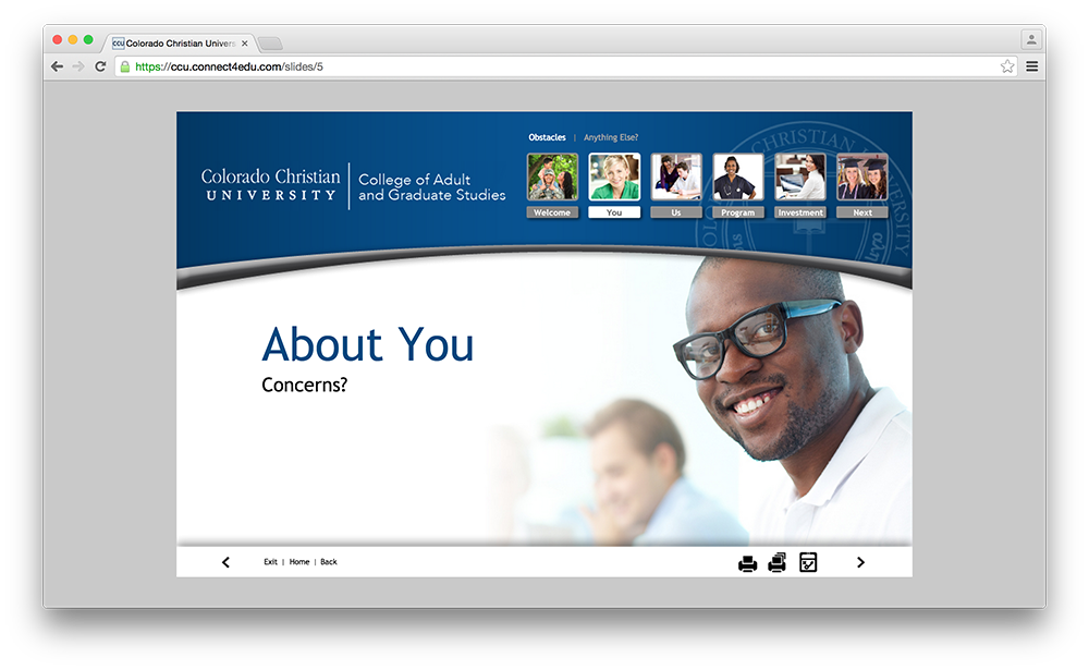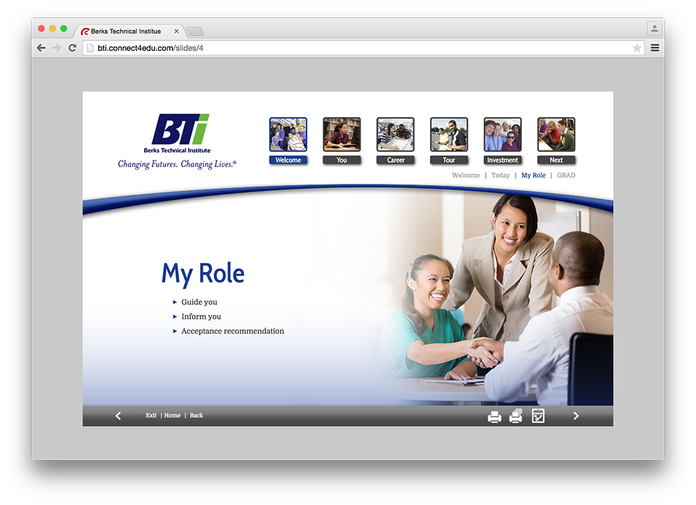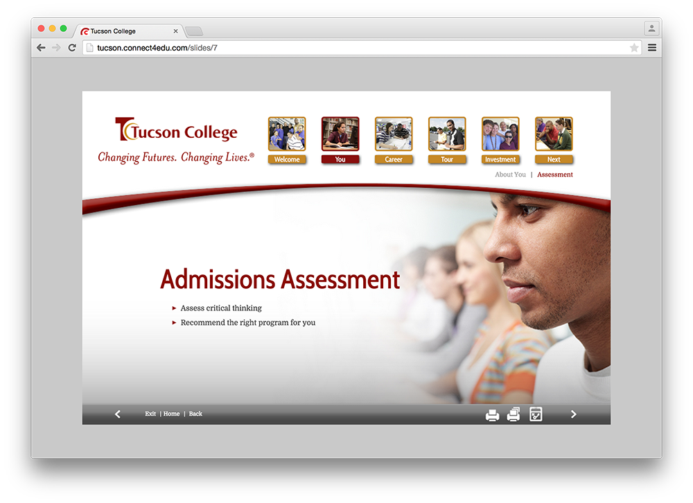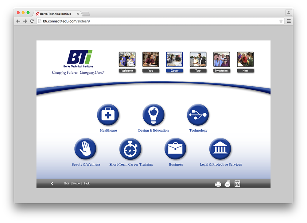 Presentation application to help schools pitch themselves to prospective students. A student and a school rep both join the same presentation and the studen’s slide is kept in sync with the rep’s via javascript polling. The presentations can have branching options that allow different pieces of data to be shown while keeping the main slide content the same.