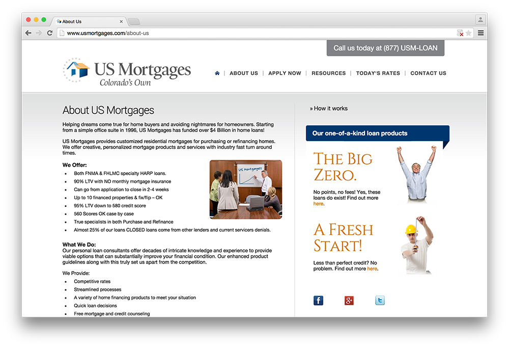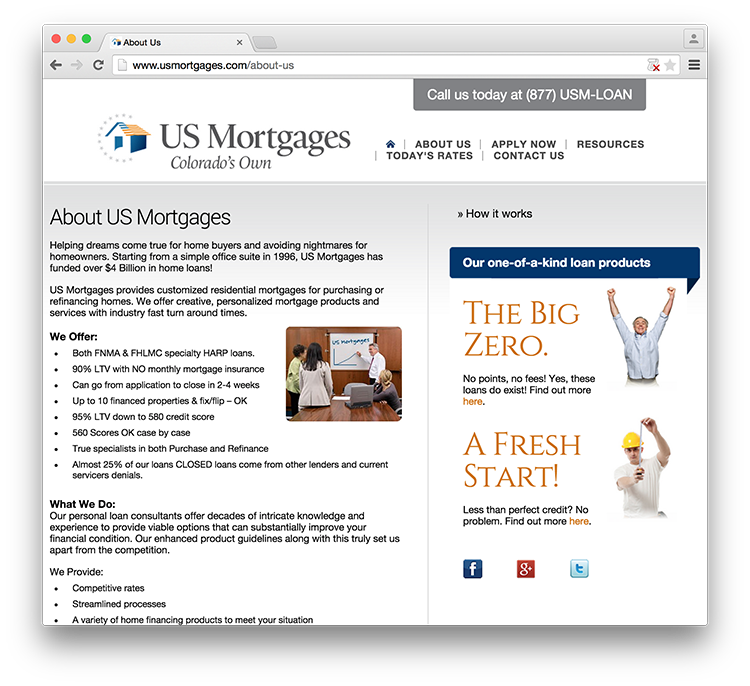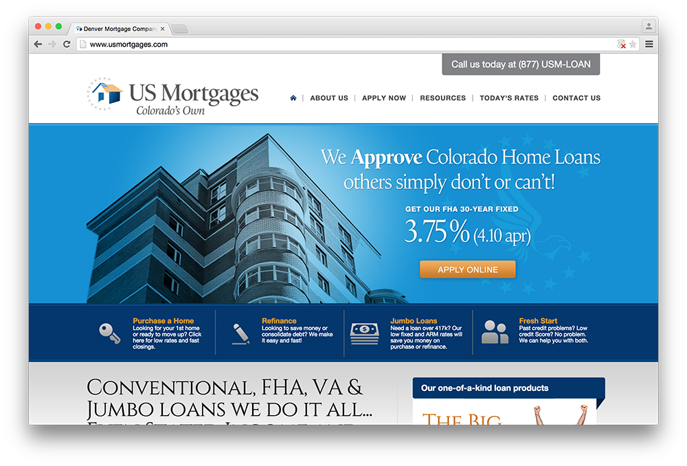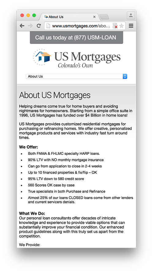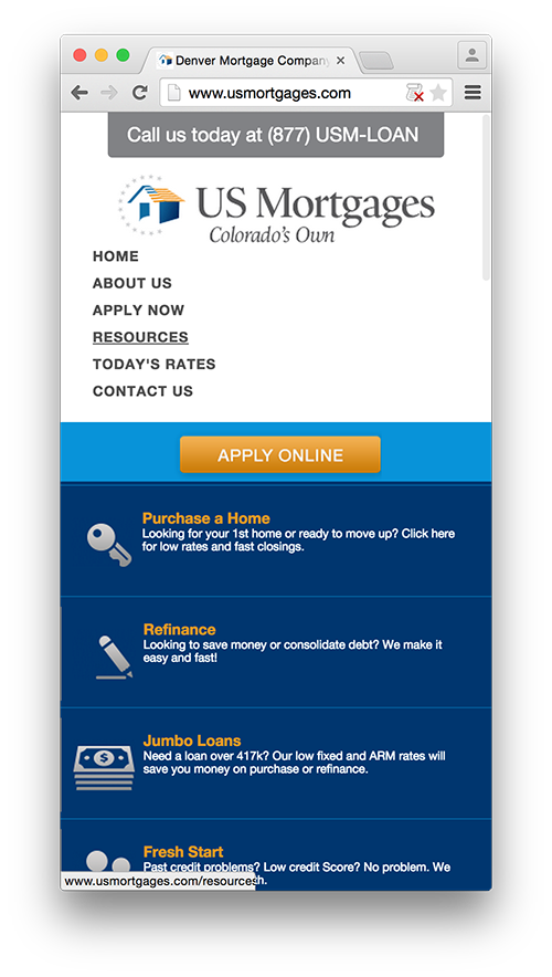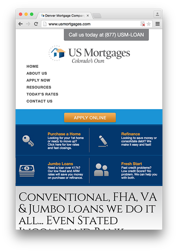 Denver mortgage company who required a fresh, responsive website. Built html templates from designer’s photoshop file; created mobile views to match designed full-width art. Built using RocketPages.